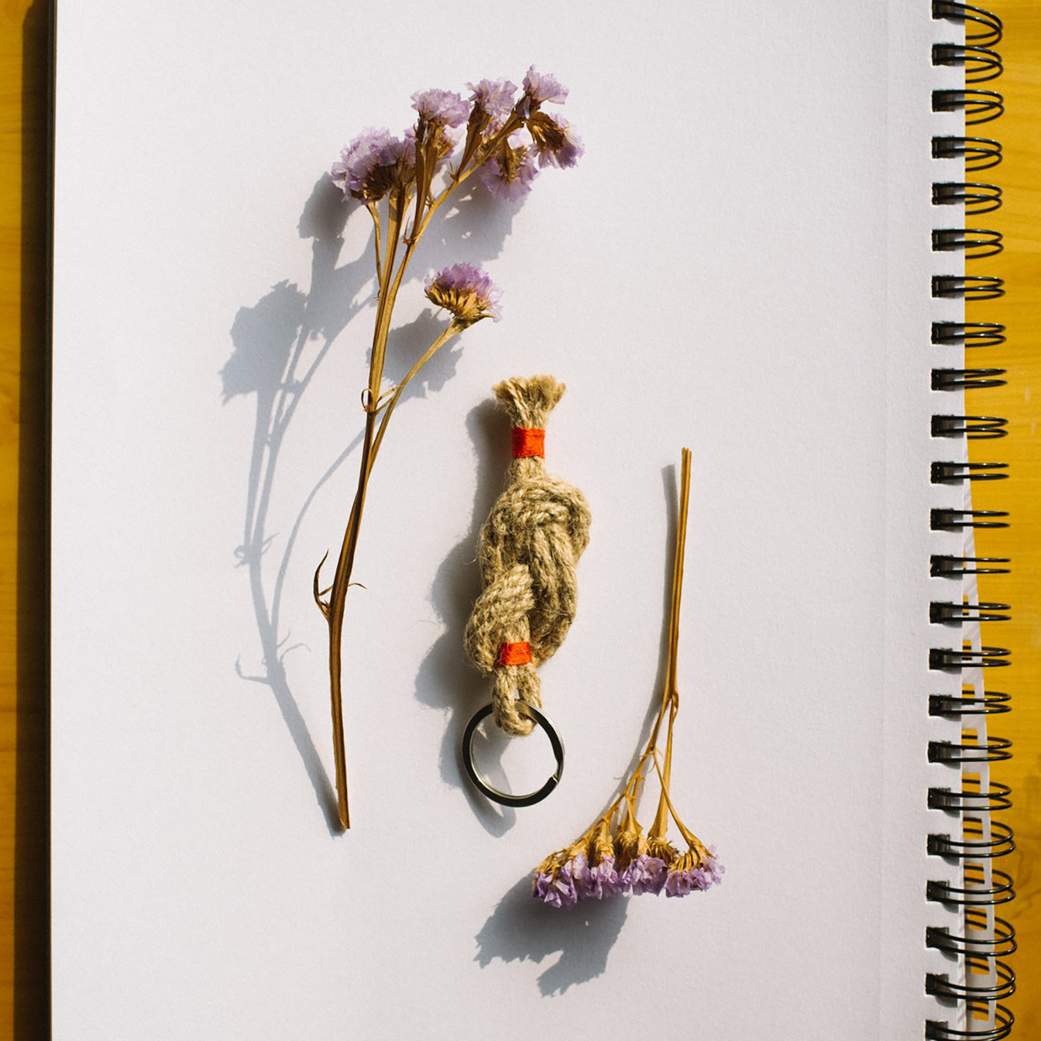 This hand-knotted jute keychain is approximately 4 inches long and comes in many different colors. Please choose your color above.