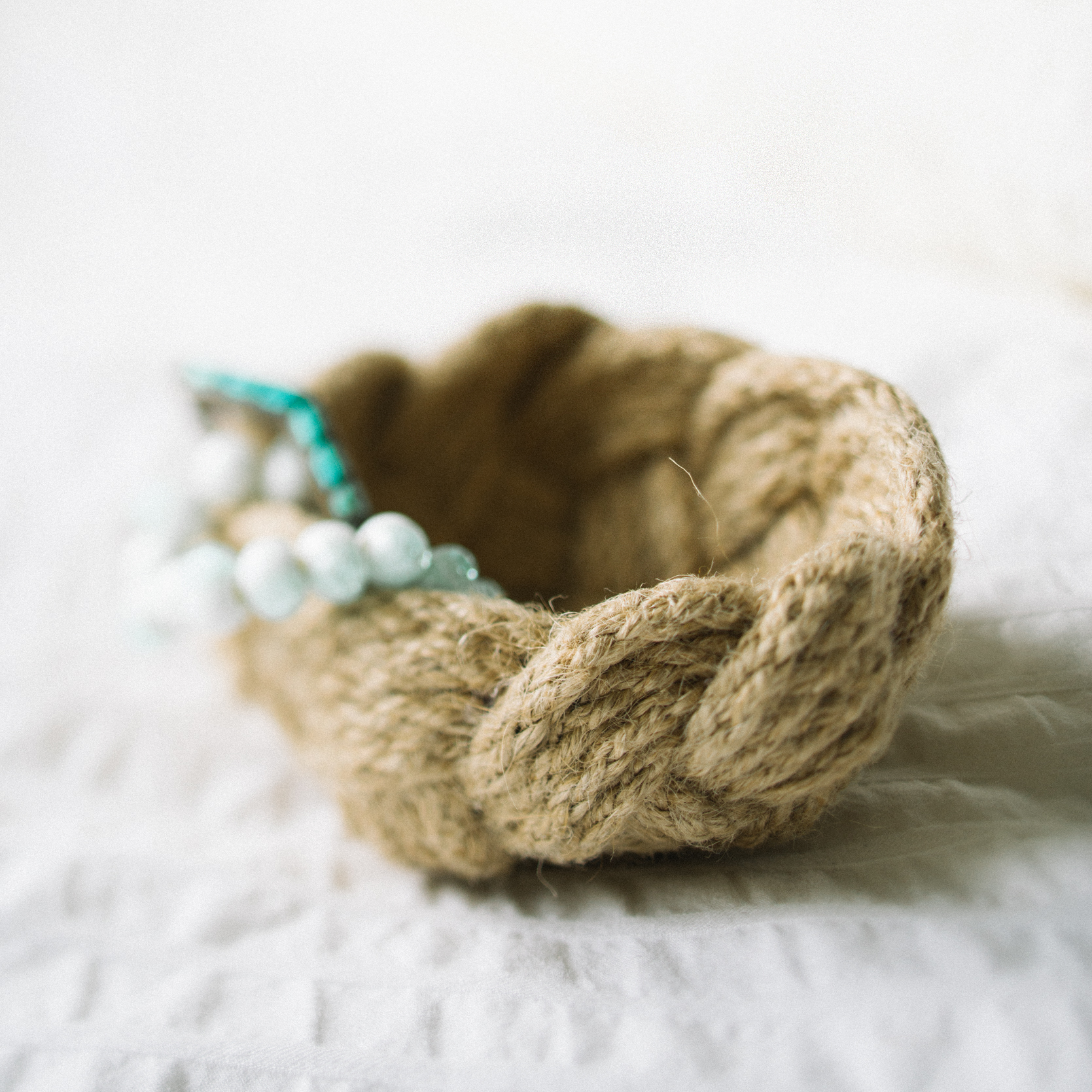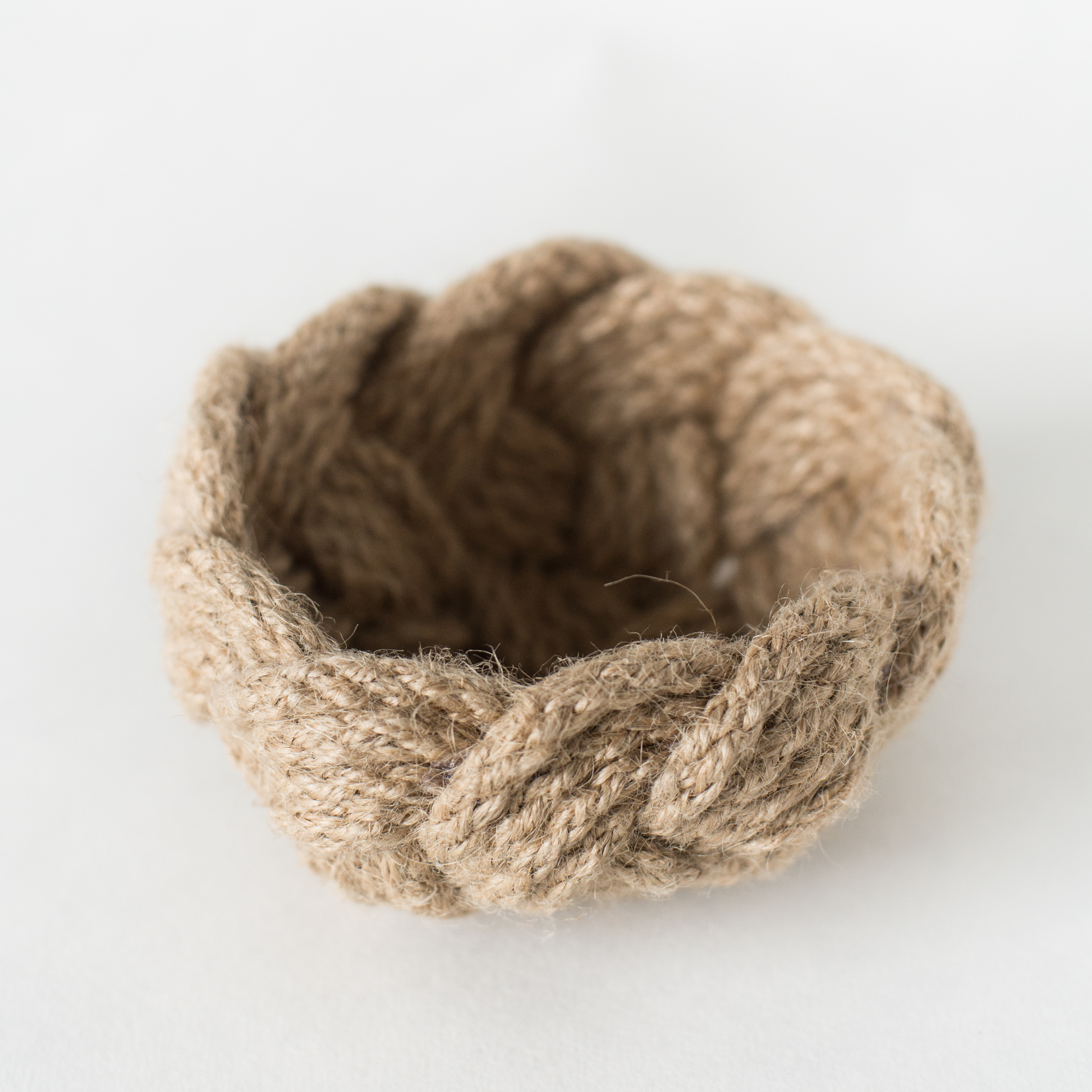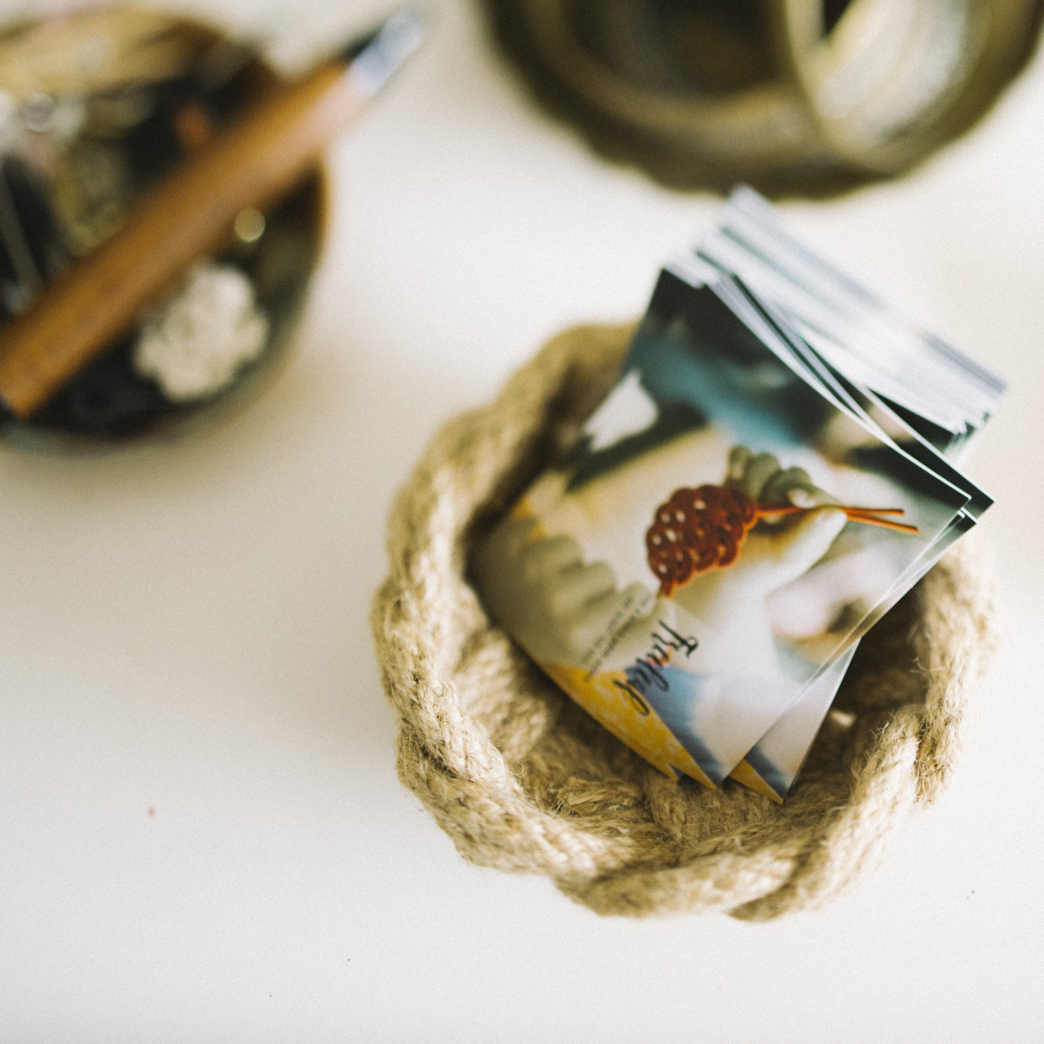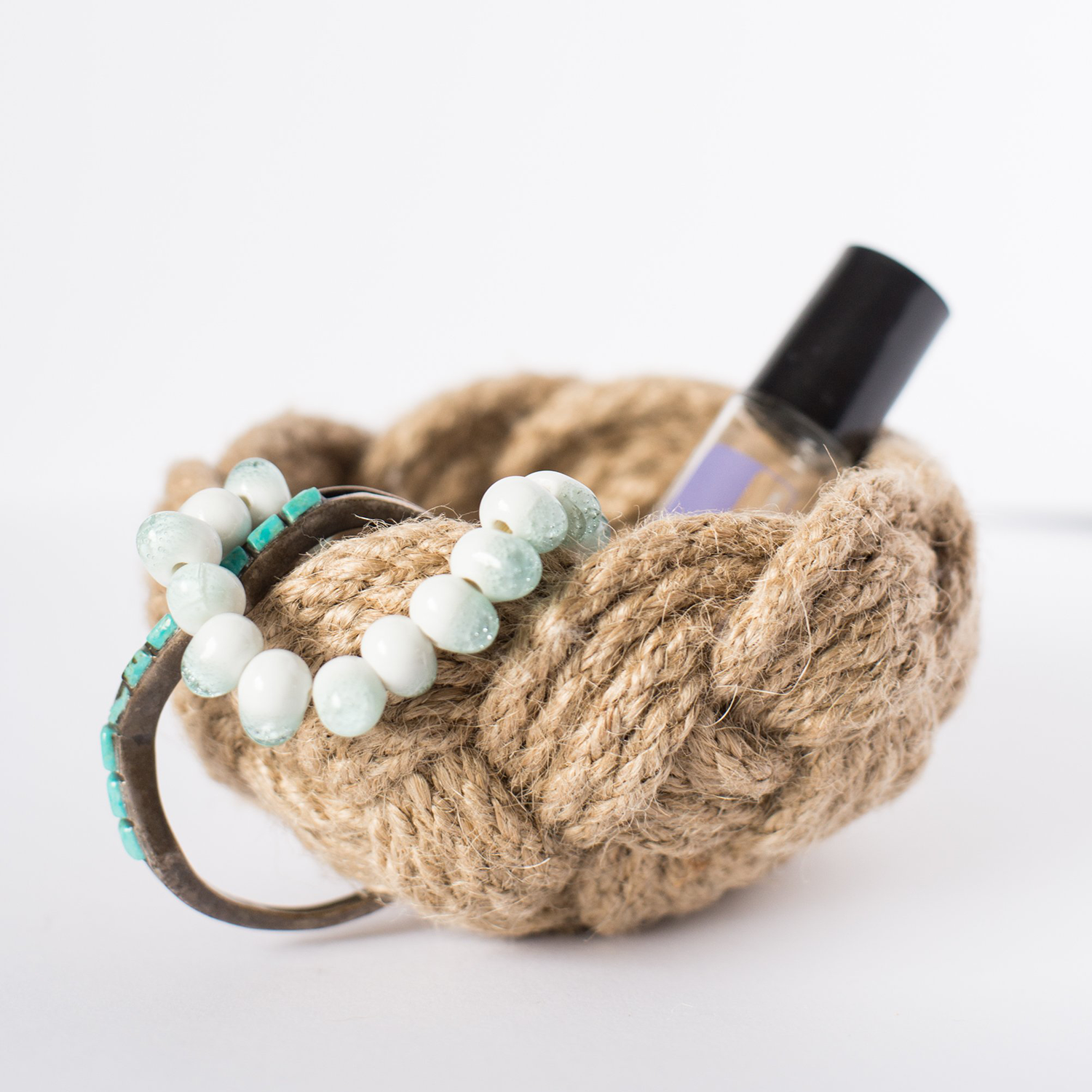 هذا الوعاء الصغير المعقود فريدٌ من نوعه. يبلغ عرضه حوالي 4 بوصات وارتفاعه 2.5 بوصة، وهو مثاليٌّ كطبق مجوهرات صغير أو لحفظ العملات. كل وعاء مصنوع يدويًا من حبل جديد بقطر 8 مم.